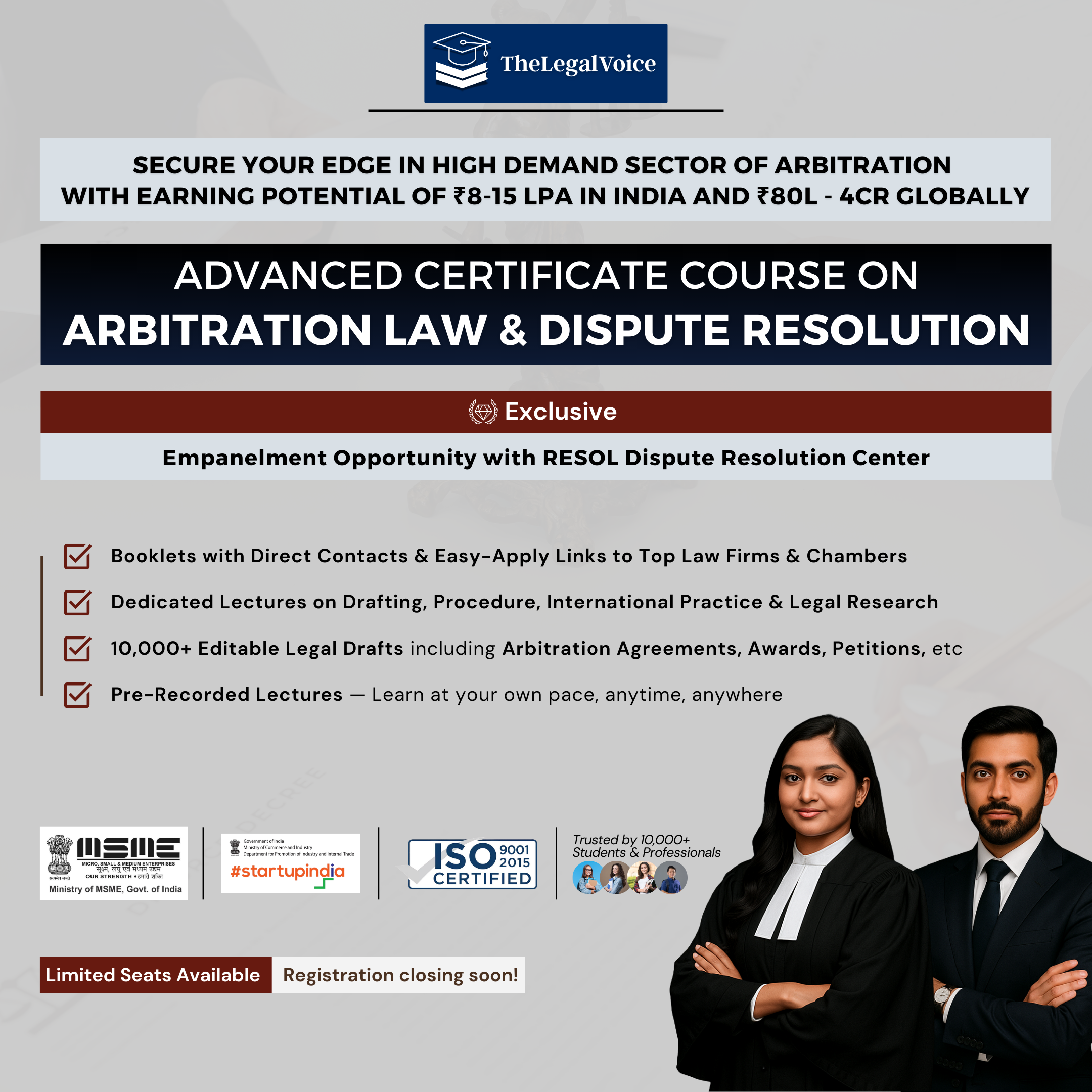 TheLegalVoice has signed an exclusive MoU with RDRC, enabling participants of this course to access this unique opportunity and be considered for empanelment with the platform.