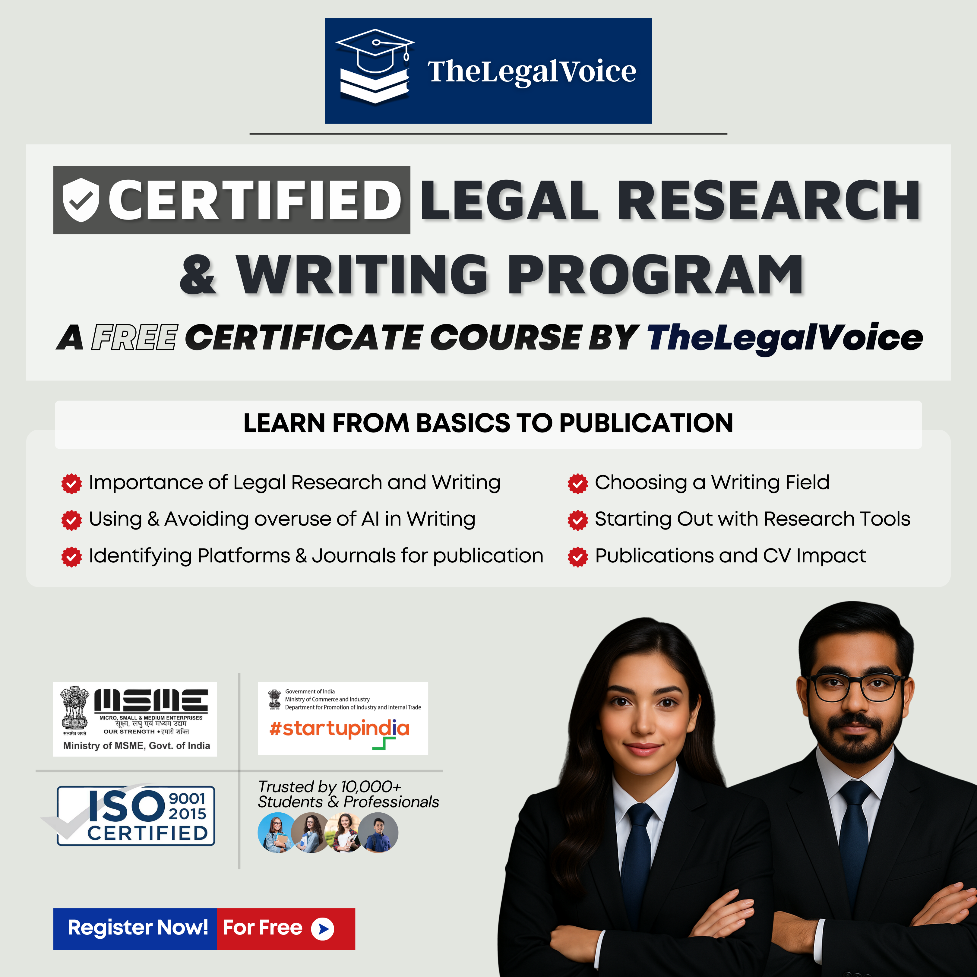 TheLegalVoice (TLV) is a premier legal ed-tech organisation, incorporated as an LLP and duly registered as a Micro, Small and Medium Enterprise (MSME) under the Government of India. It is recognised as a Startup by the Department for Promotion of Industry and Internal Trade (DPIIT) and holds the ISO 9001:2015 certification, reflecting its commitment to quality and excellence.