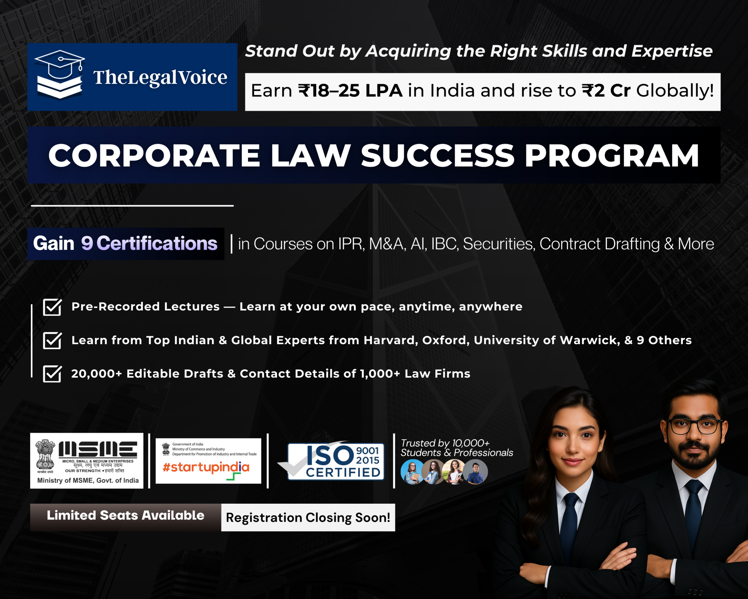 In today’s competitive landscape, the corporate legal world is filled with opportunities. To achieve your dream of becoming a successful corporate lawyer, it’s essential to stand out by acquiring the right skills and expertise. TheLegalVoice is proud to present its Corporate Law Success Program, a comprehensive initiative designed to help students and professionals excel in their corporate law careers. This Advanced Online Corporate Law Certificate Course offers recorded lectures by leading experts from top global institutions and law firms, including Harvard, Oxford, Shardul Amarchand Mangaldas (SAM), Saraf & Partners, Spice Route Legal, and Saikrishna & Associates & numerous other leading organisations. The program also includes internship opportunities, publication prospects, and access to exclusive legal resources, making it a comprehensive platform for aspiring corporate law professionals.