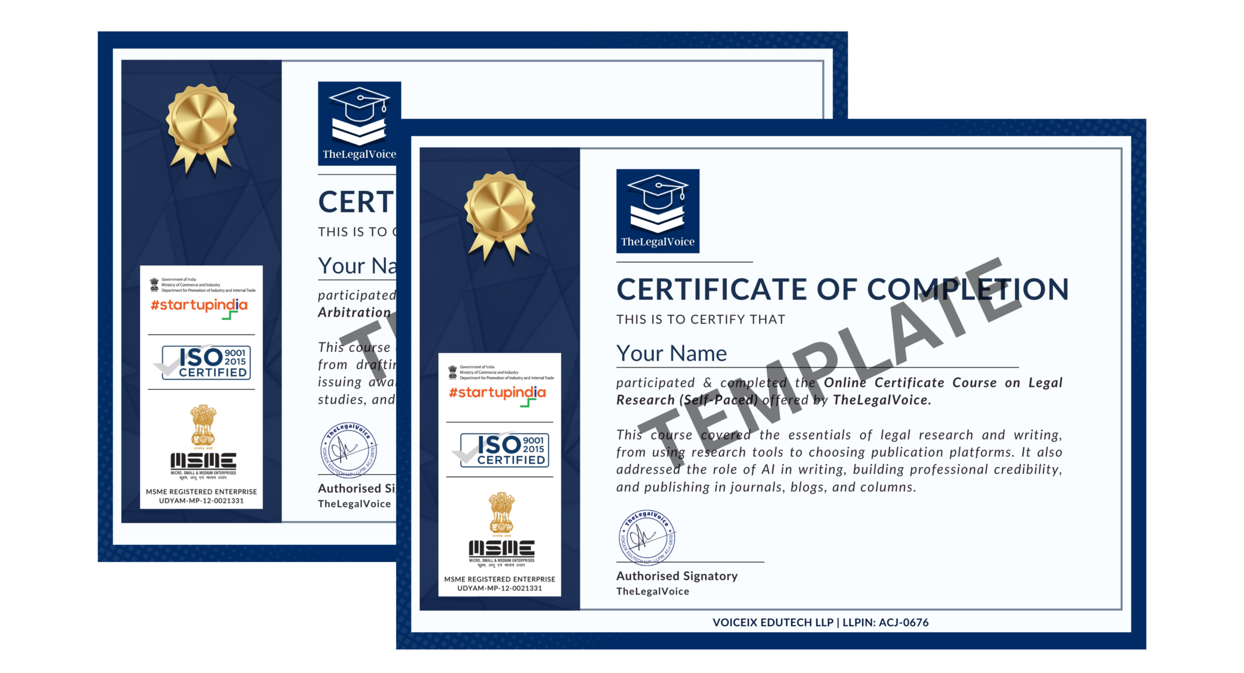 You will receive two certificates—one in Arbitration Law and another in Legal Research—from TheLegalVoice. These certifications enhance your legal profile and add value to your CV.