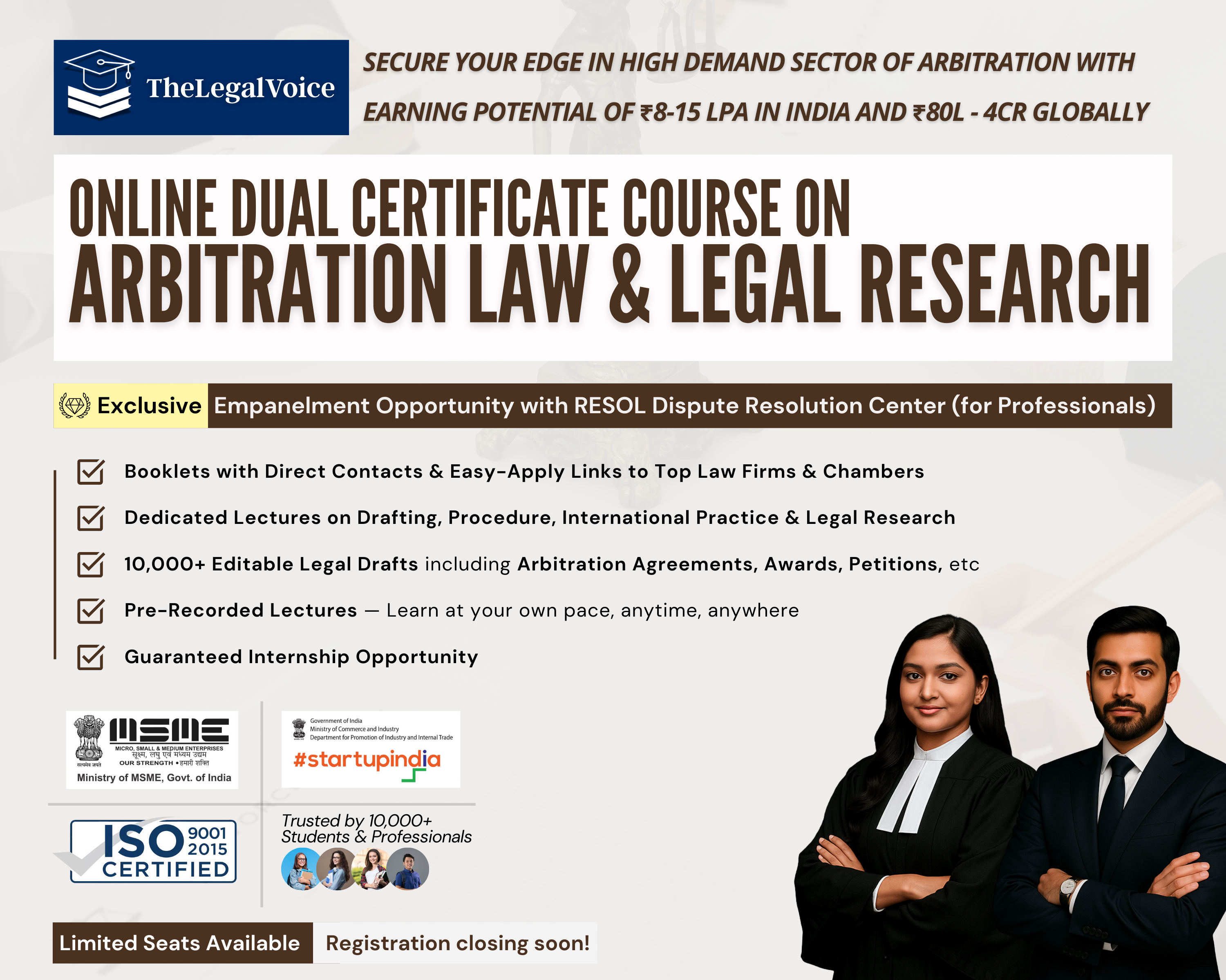 TheLegalVoice proudly presents its Dual Certificate Course on Arbitration Law & Legal Research, a comprehensive program designed to equip students and professionals with advanced skills in arbitration practice, drafting, research methodology, and legal analysis. This advanced online course features recorded lectures delivered by leading experts from top global institutions, law firms, and arbitral organisations.