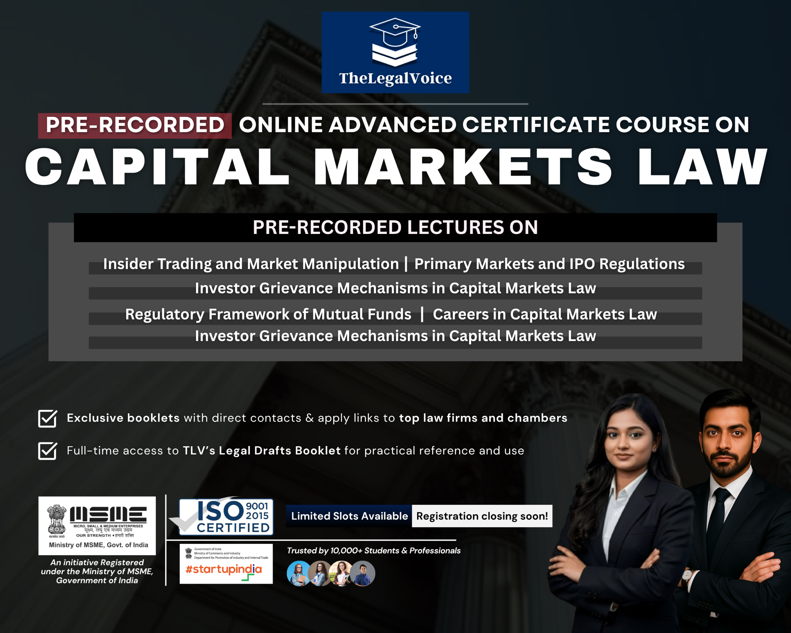 The course is open to aspirants preparing for competitive examinations, law students at any level, professionals working in the corporate or financial sector, advocates and legal practitioners interested in capital markets regulation, compliance, and capital markets, as well as anyone keen to gain a structured understanding of capital markets and its practical applications.