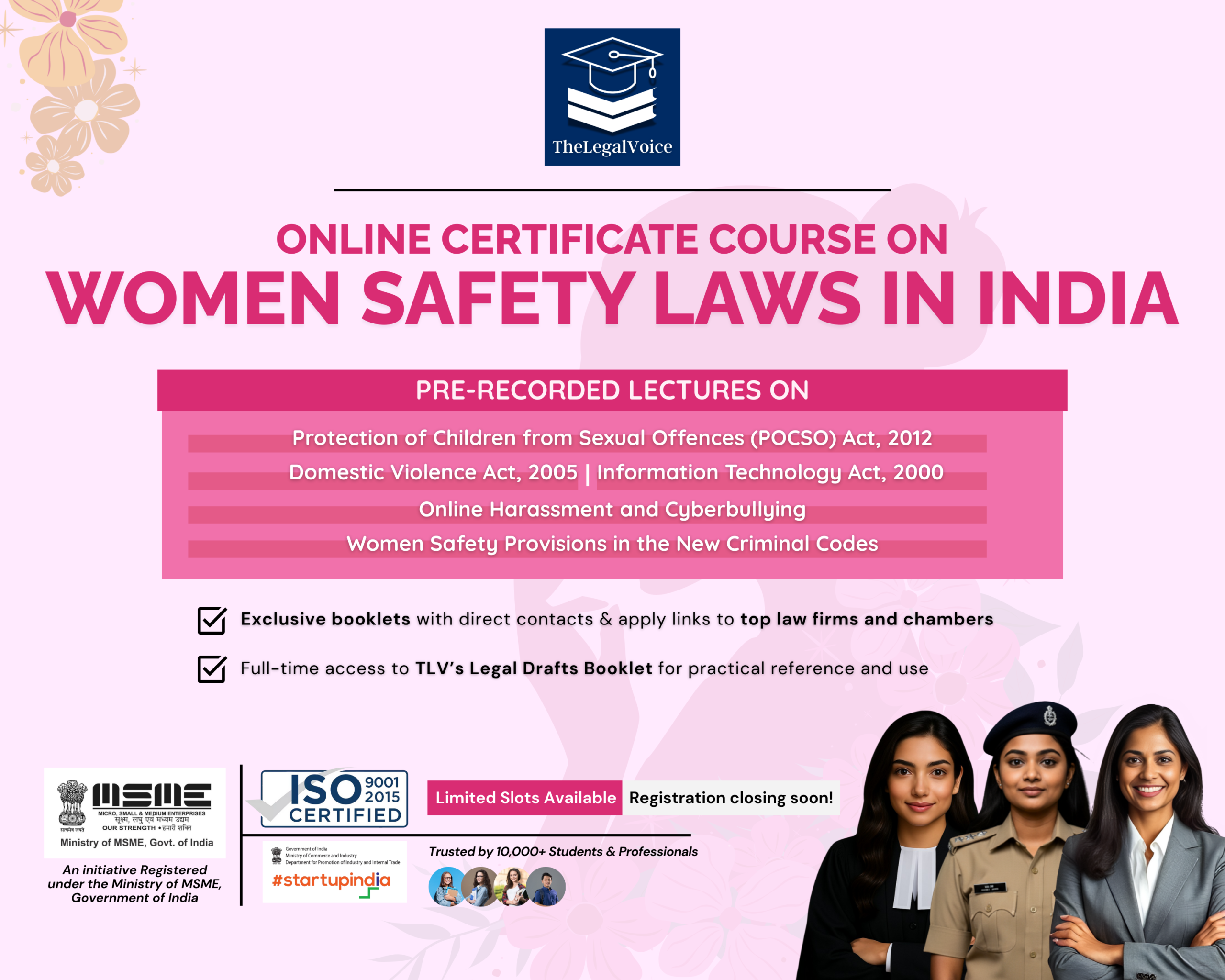 This course is designed for a broad range of learners and professionals committed to women’s rights, gender justice, and legal awareness. It is suitable for law students (UG & PG), recent legal graduates, practicing advocates, in-house counsels, and young lawyers who wish to deepen their knowledge of women safety laws.