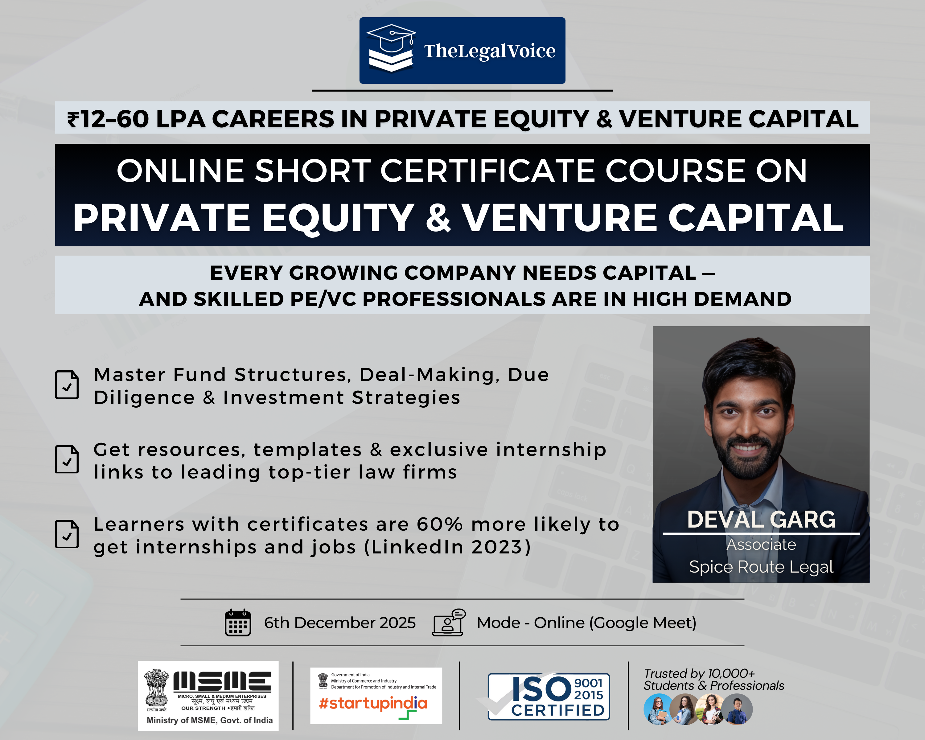 TheLegalVoice (TLV) is a leading legal ed-tech organisation, incorporated as an LLP and registered as a Micro, Small and Medium Enterprise (MSME) under the Government of India. It is also recognised as a Startup by the Department for Promotion of Industry and Internal Trade (DPIIT) and holds the ISO 9001:2015 certification, reflecting its commitment to quality and excellence.