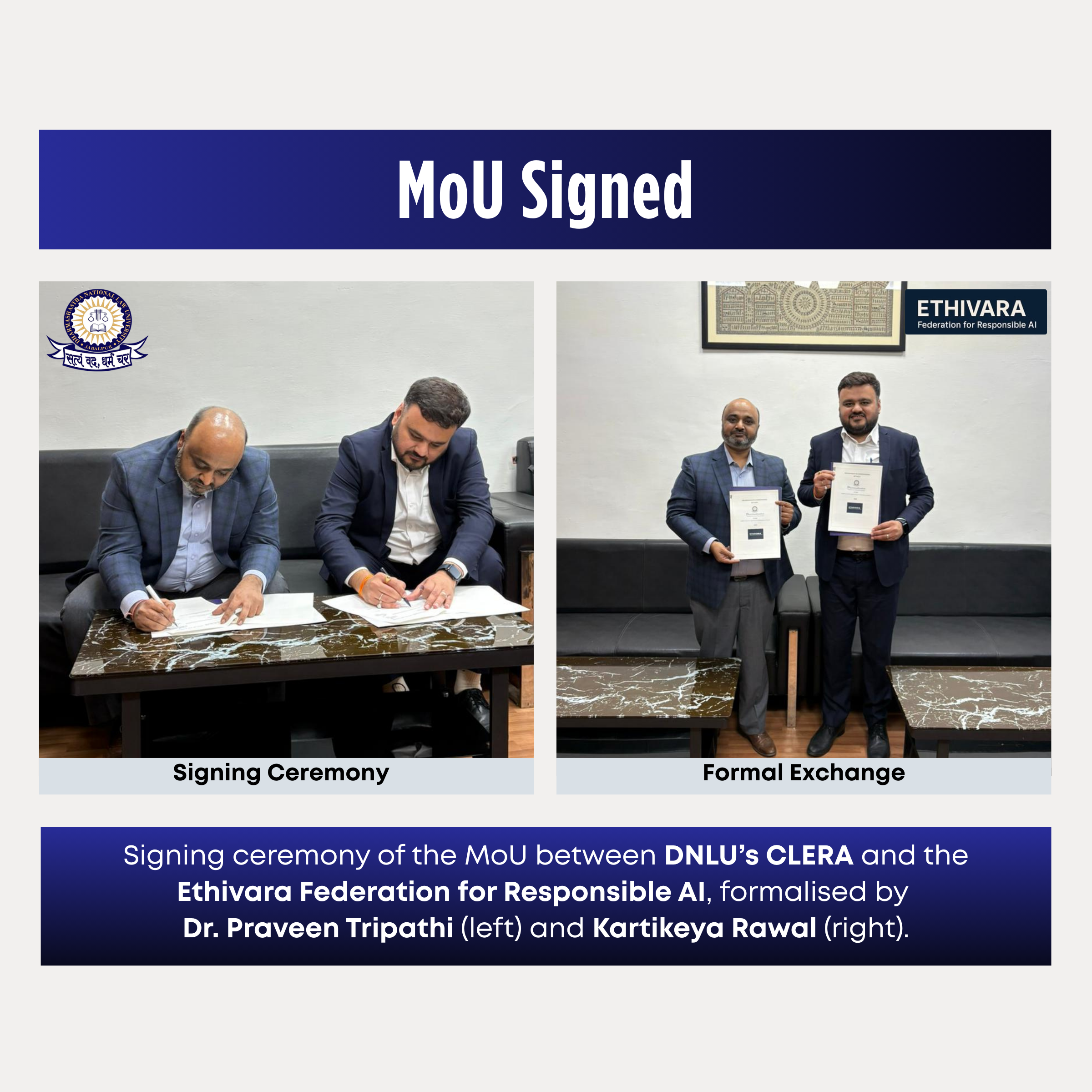 Under the leadership and vision of Prof. (Dr.) Manoj Kumar Sinha, Vice-Chancellor, DNLU the MOU was signed by Dr. Praveen Tripathi, Registrar of DNLU, and Kartikeya Rawal, Director at the Ethivara Federation for Responsible AI.